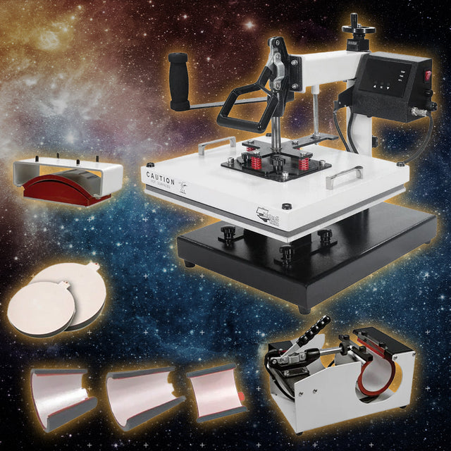 Further expanding the capabilities of this machine are the interchangeable attachments: (1) Cap Attachment, (2) Sublimation Plate Attachments, and (4) Sublimation Mug Attachments. The Cap and Sublimation Plate attachments are mounted directly to the machine and used in place of the 15"x15" heating element and its accompanying lower platen. The Sublimation Mug Attachments are used with the included carriage, which is connected to the heat press and placed directly adjacent to the machine.